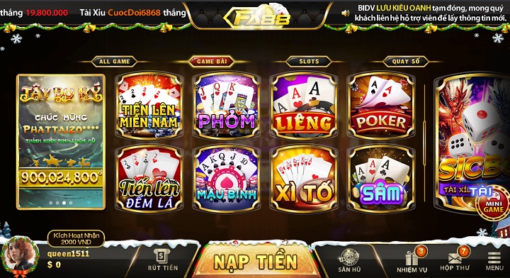 Được mệnh danh là game bài quốc dân, có số lượng người đam mê đông đảo, nhanh chóng trở thành cái tên được ưu tiên chọn lựa của nhiều đối tượng người chơi. Ngay tại giao diện chính của FA88 Club, người chơi có thể dễ dàng nhìn thấy tựa game và lựa chọn. Chỉnh với một cái click chuột nhẹ nhàng, lập tức có thể tìm được bàn chơi phù hợp và trải nghiệm.