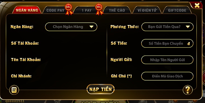 Bước 3: Người chơi lựa chọn hình thức nạp tiền mà mình muốn sử dụng, bao gồm: nạp qua ngân hàng, 1 pay, thẻ cào, ví điện tử hay giftcode, …